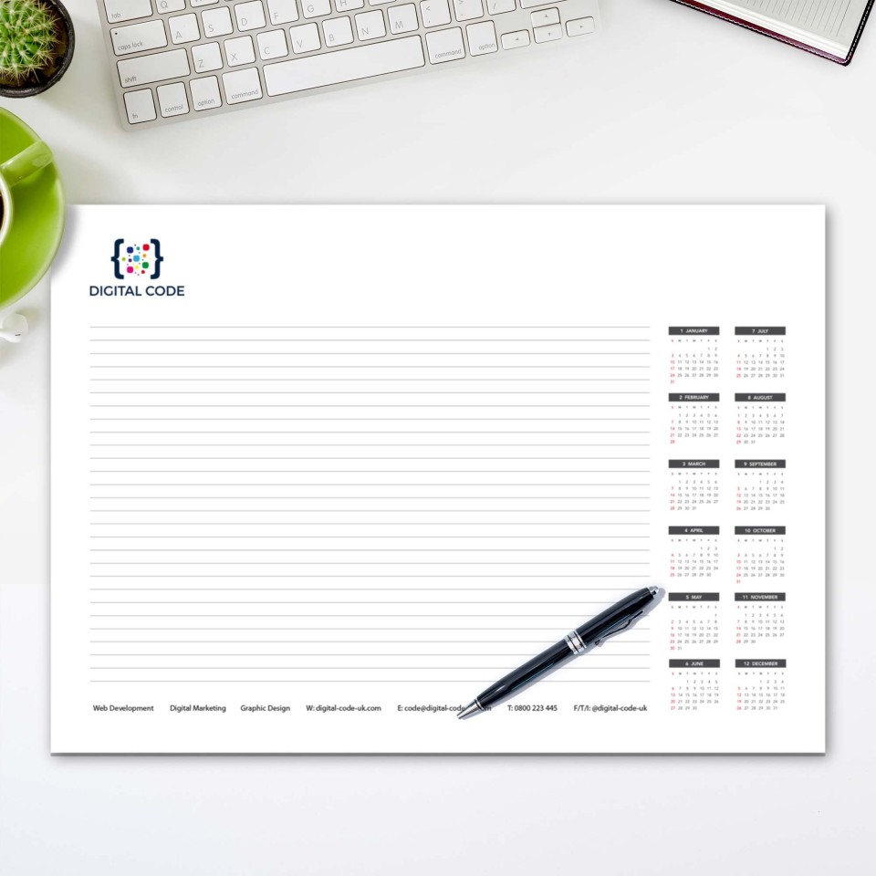 A custom printed desk pad is a great way to smuggle your branding onto the desks of employees,customers and suppliers,year round. Placed centre stage in the middle of their working environment,a desk pad is great for taking notes,checking dates and generally staying on top of things. Emblazoned with your branding,contact details,promotional messages and maybe even product photography,your personalised desk pads will work had to promote your organisation 365 days a year.
