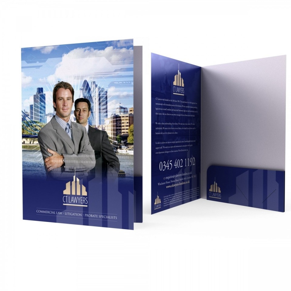 Our folders will be delivered to you laminated,creased,folded,glued and ready-to-go... we've done all the hard work so you don't have to! Give your information packs,presentations,quotations,estimates and proposals the impact they deserve.