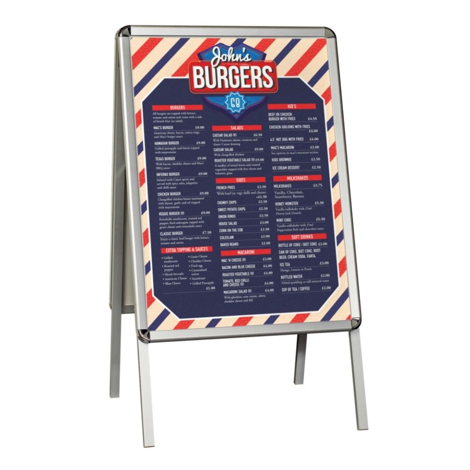 Increase your footfall with a pavement A-Frame Sign. Suitable for use indoors or out,our lightweight brushed aluminium A-Frames snap open and shut,allowing you to switch and replace your graphics as required.